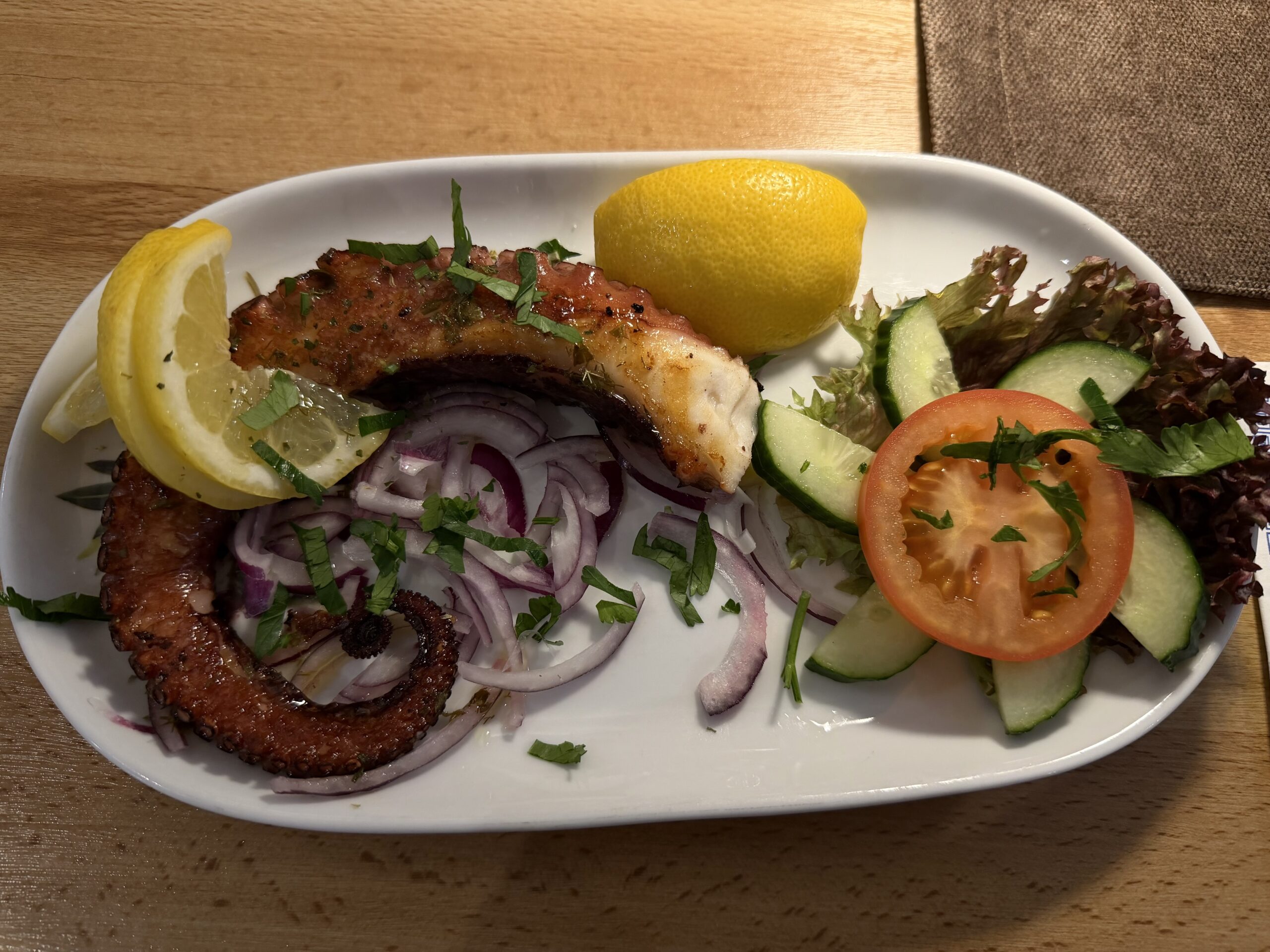 Sehr schön serviert, ausreichend Zitrone. Leider etwas zäh, trotzdem gut.
