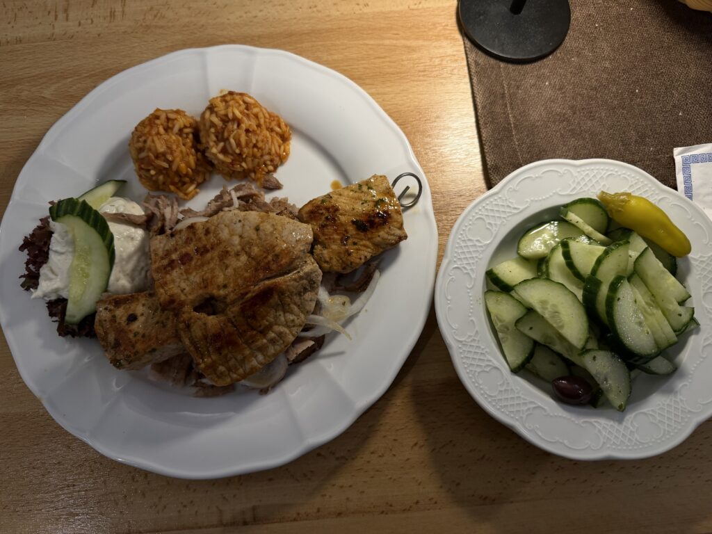 Hauptspeise: Die Metaxa-Platte mit Gyros, Schweinesteak und Souvlaki. Dazu Reis und Zaziki. Der Beilagensalat wie immer nur Gurke 🙂
