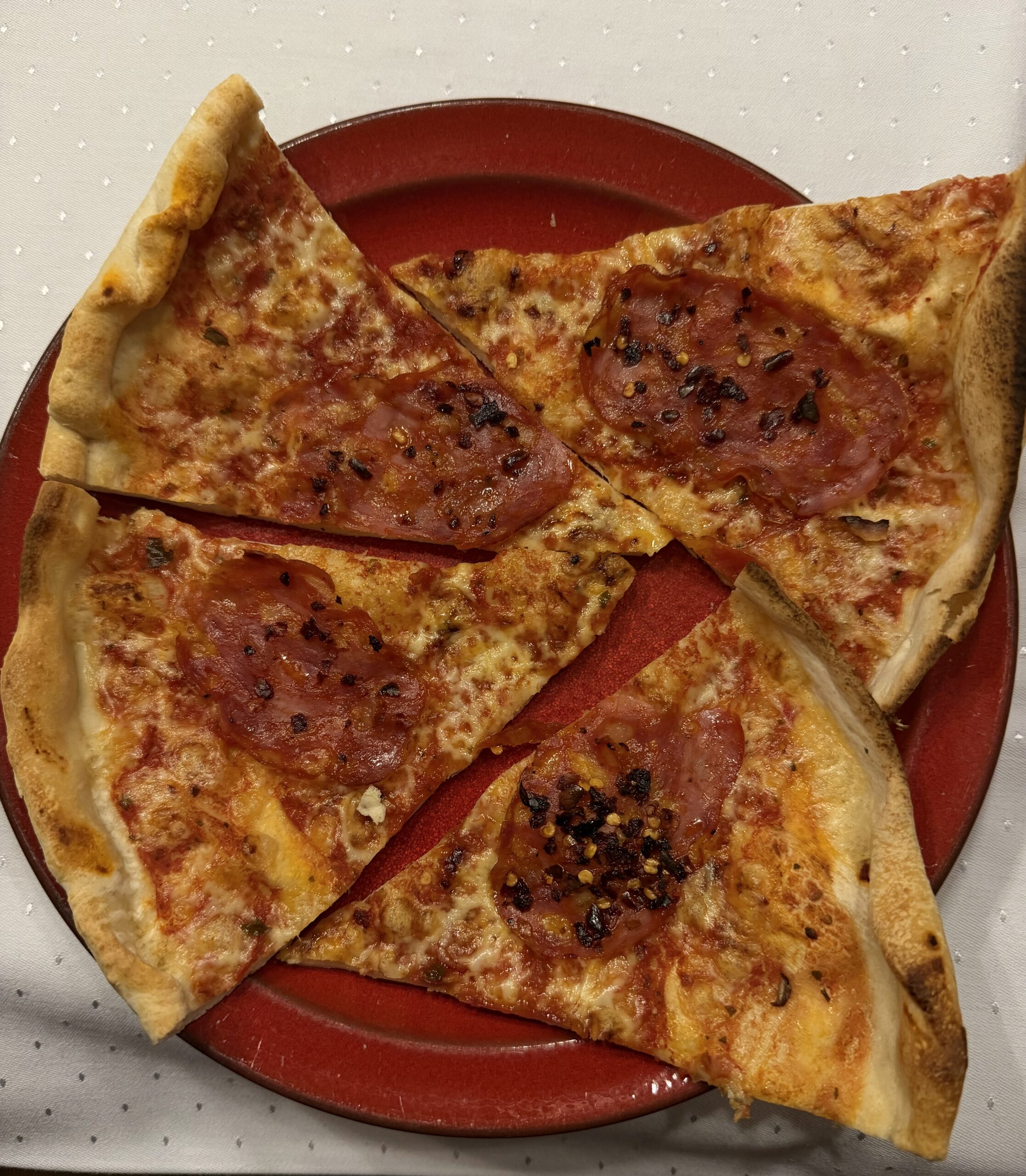 Eine Große Pizza mit Chorizo Salami und einem Scharfen Chili Pulver.
