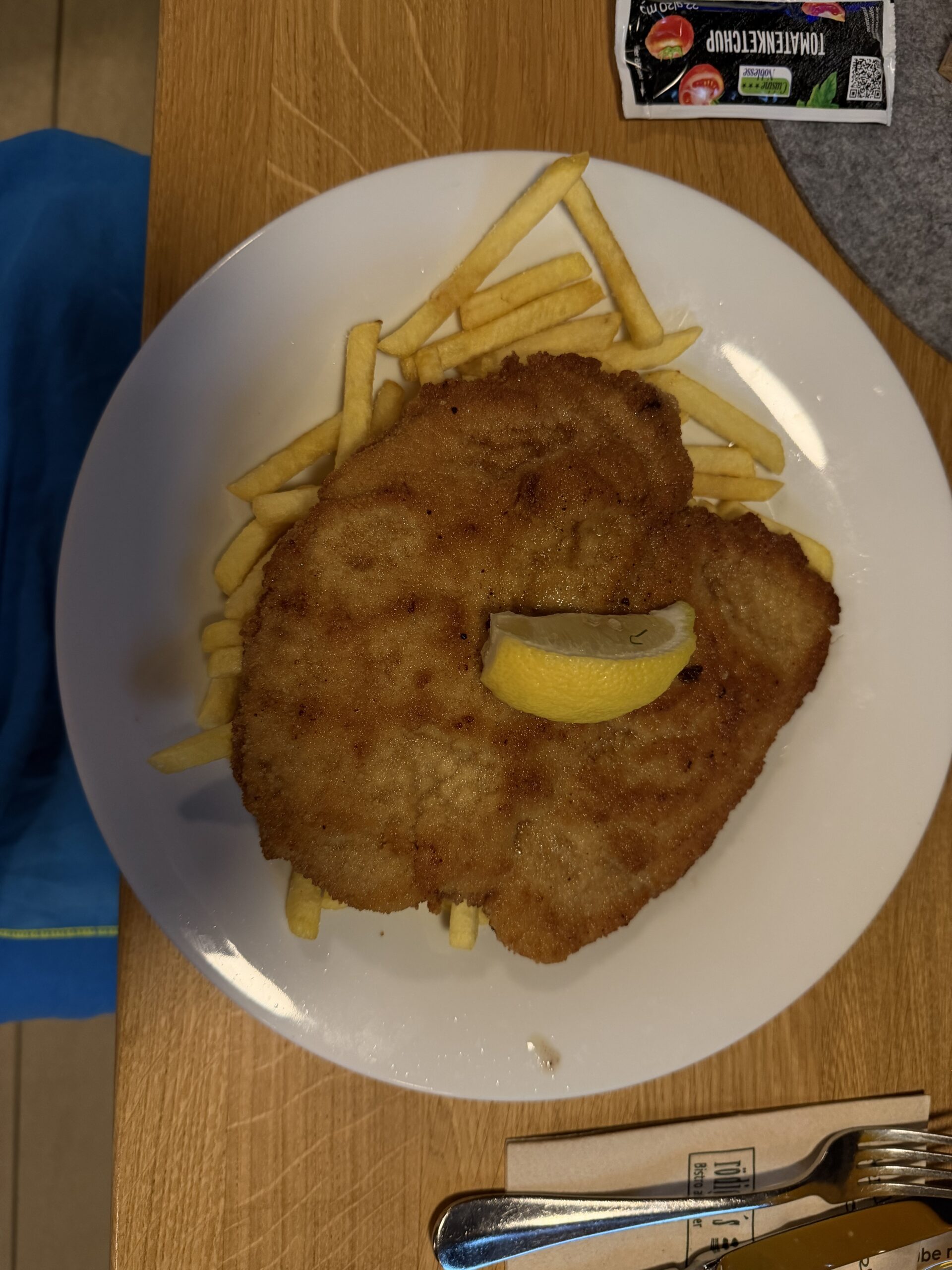 Schlusswort: Sehr gutes Schnitzel, Bratkartoffeln mit etwas weniger Fett braten und 1 Scheibe Zitrone mehr, dann 10/10.