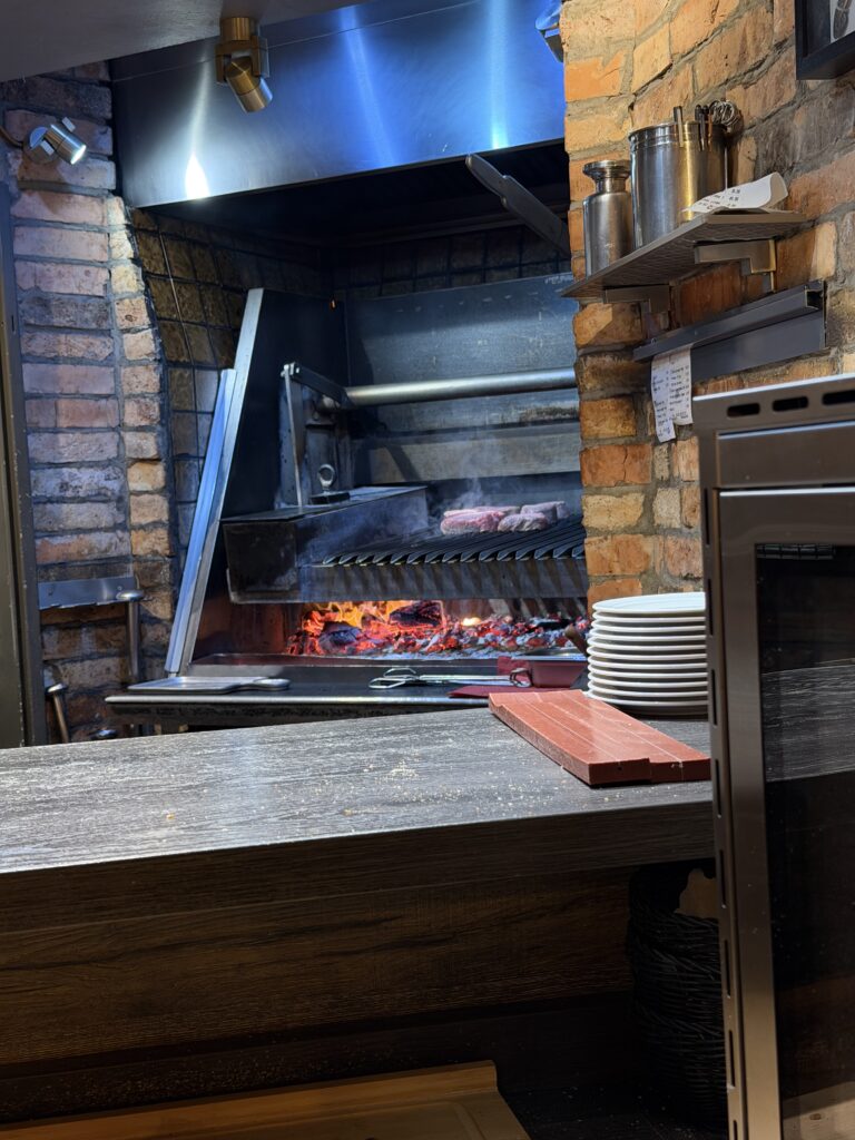 Holzkohle Grill, schönes Fabrikat. Jedes Stück Fleisch wurde vorher (wahrscheinlich) mit Öl eingestrichen und danach mit einer erstaunlich großen PriseSalz übergossen.