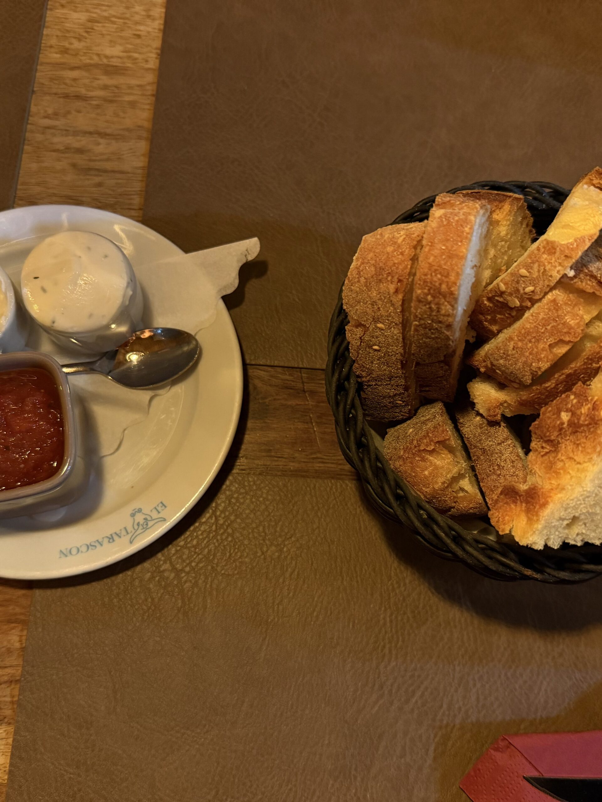 Schön serviert, Brot sehr Knusprig, Rote Soße war scharf. Gute Vorspeise (1,50€ pro Körbchen Brot)