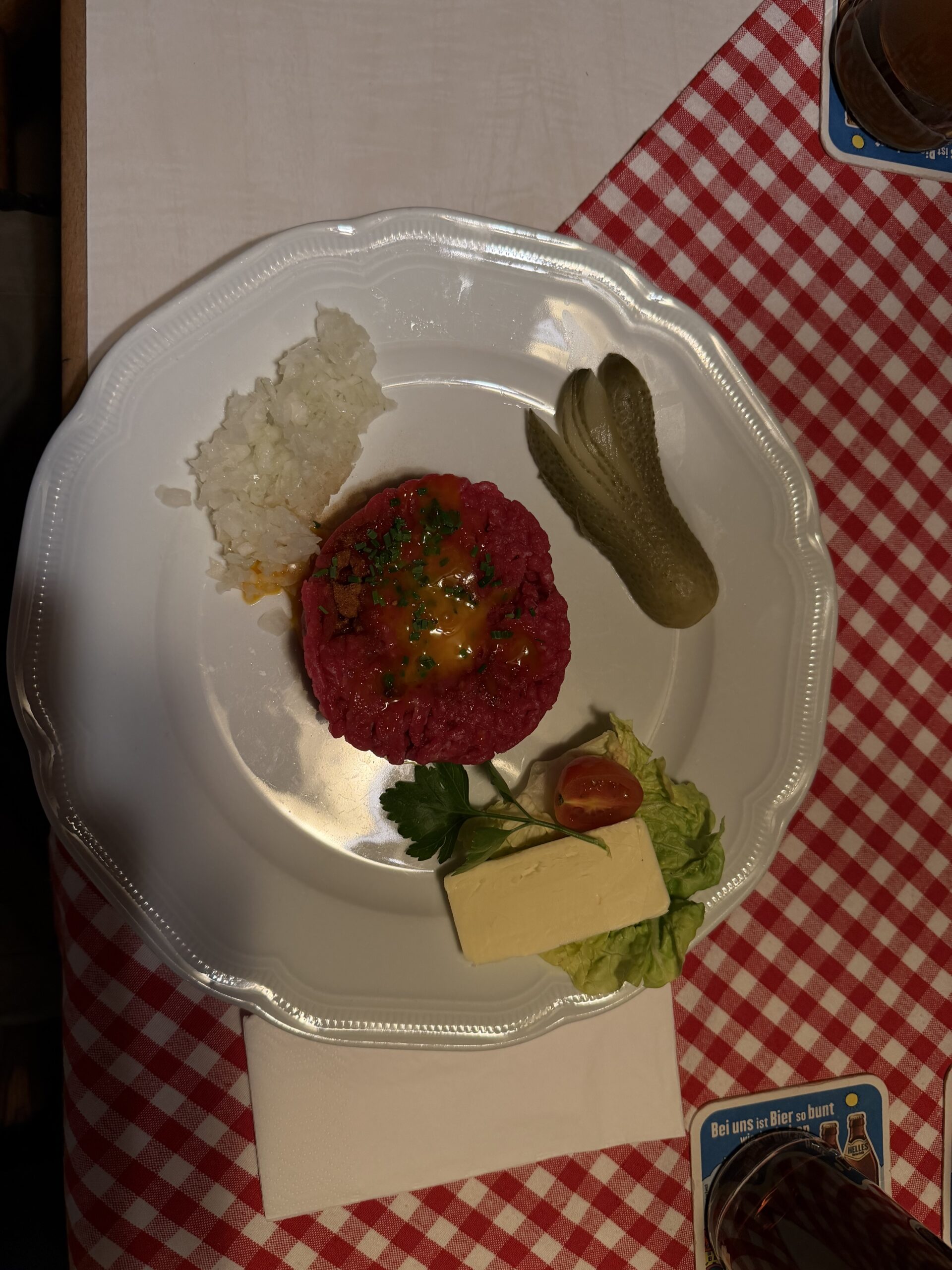 Schön serviert, mit Zwiebeln, Brot und Butter. Das richtige Anmachen des Tatars ist eine Kunst, die über den perfekten Geschmack entscheidet.