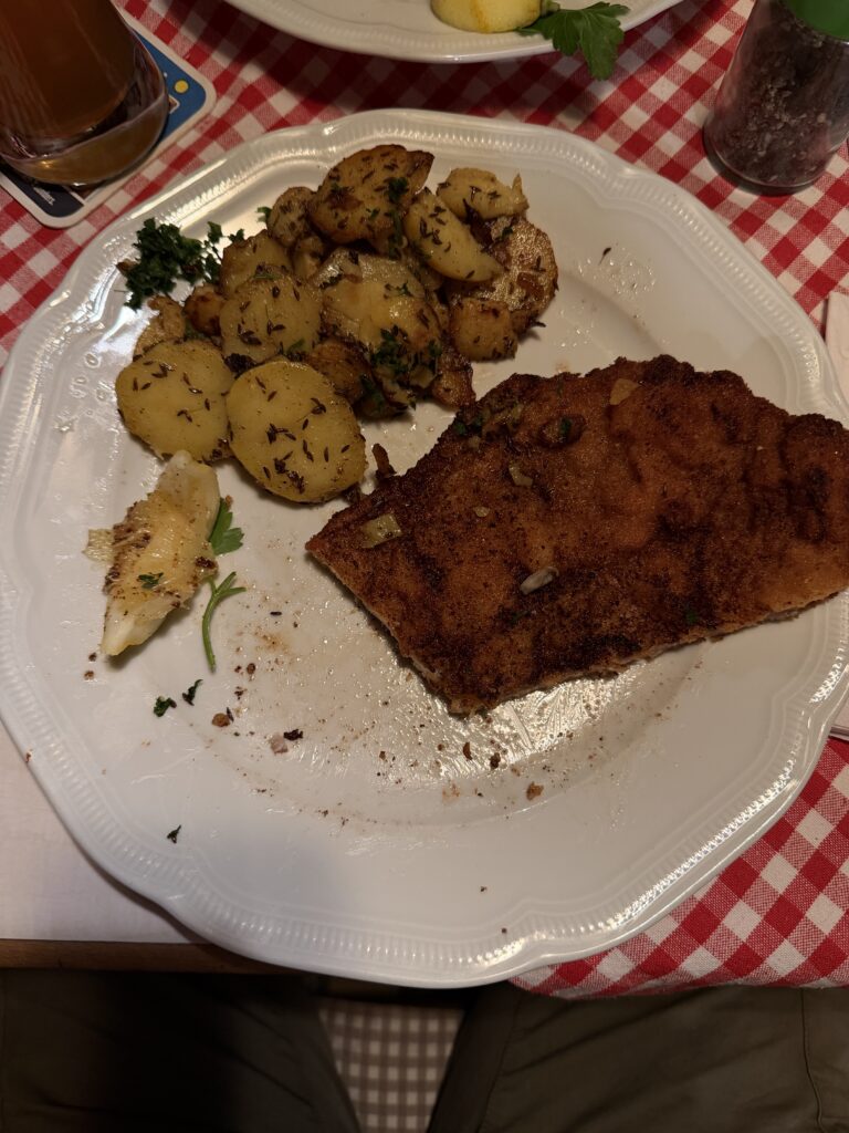 Hauptspeise: Ein Pfannenschnitzel mit Bratkartoffeln. (Hatte Hunger, deswegen habe ich schon angefangen zu essen**,** bevor ich das Bild gemacht habe.)