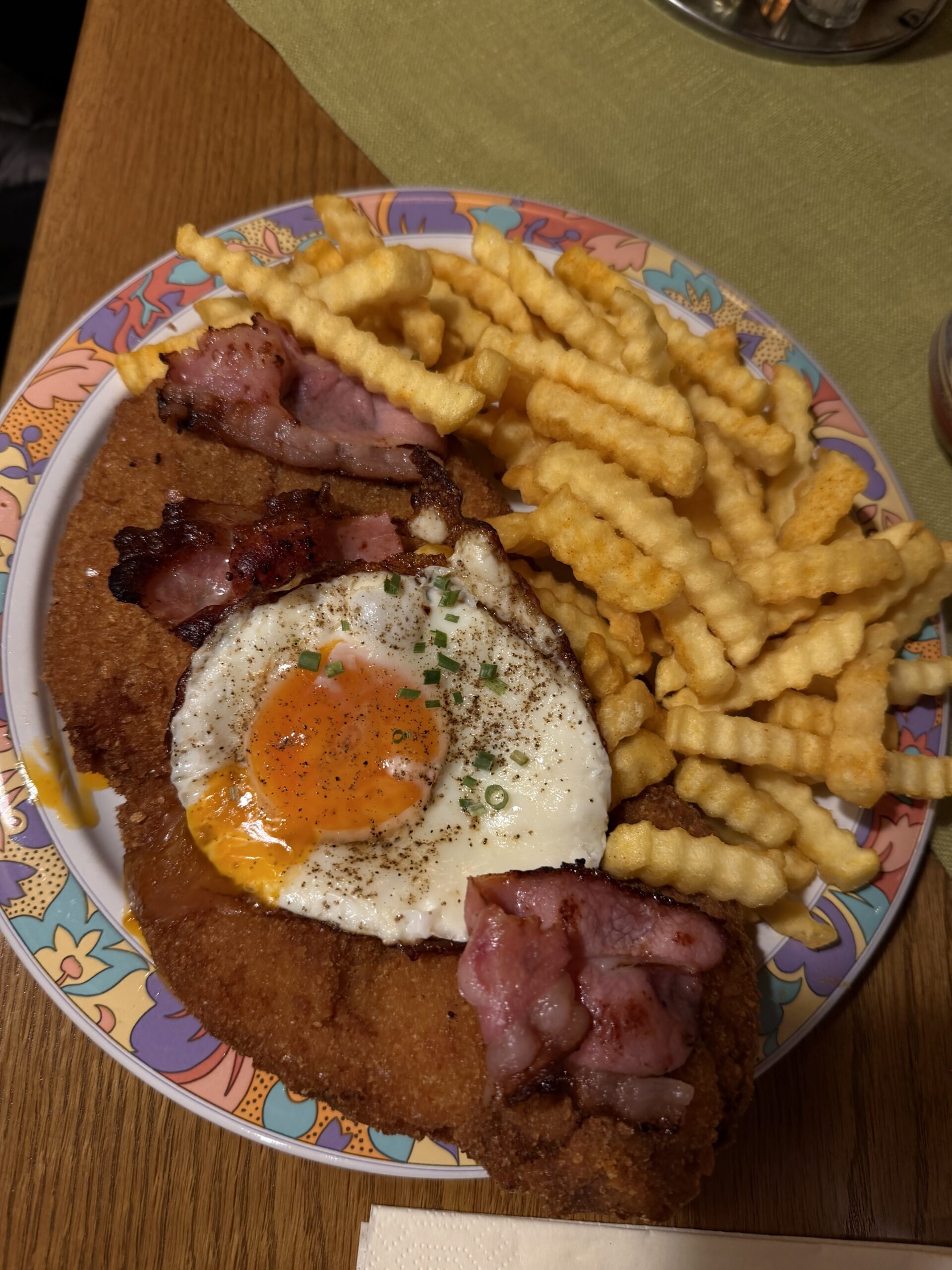 Das Zusammenspiel aus Ei, Speck und Schnitzel ist eine Symphonie!