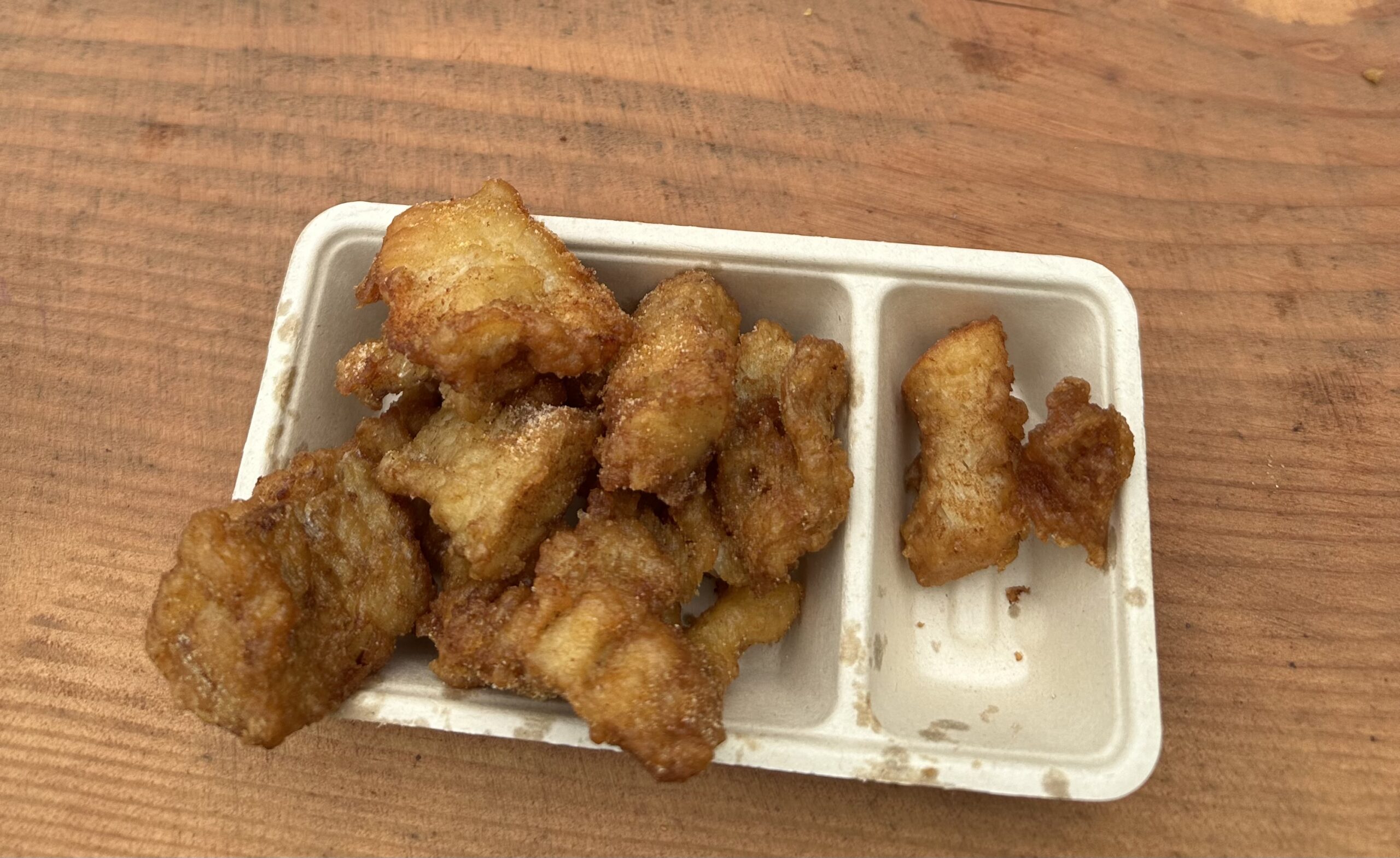 Goldbrauner Kibbeling, wie er sein muss: außen knusprig, innen zart. Mit einem Klecks Sauce (war erst skeptisch deswegen hab ich keine Sauce auf meiner Portion. Habe bei meinem Cousin geklaut xD ).