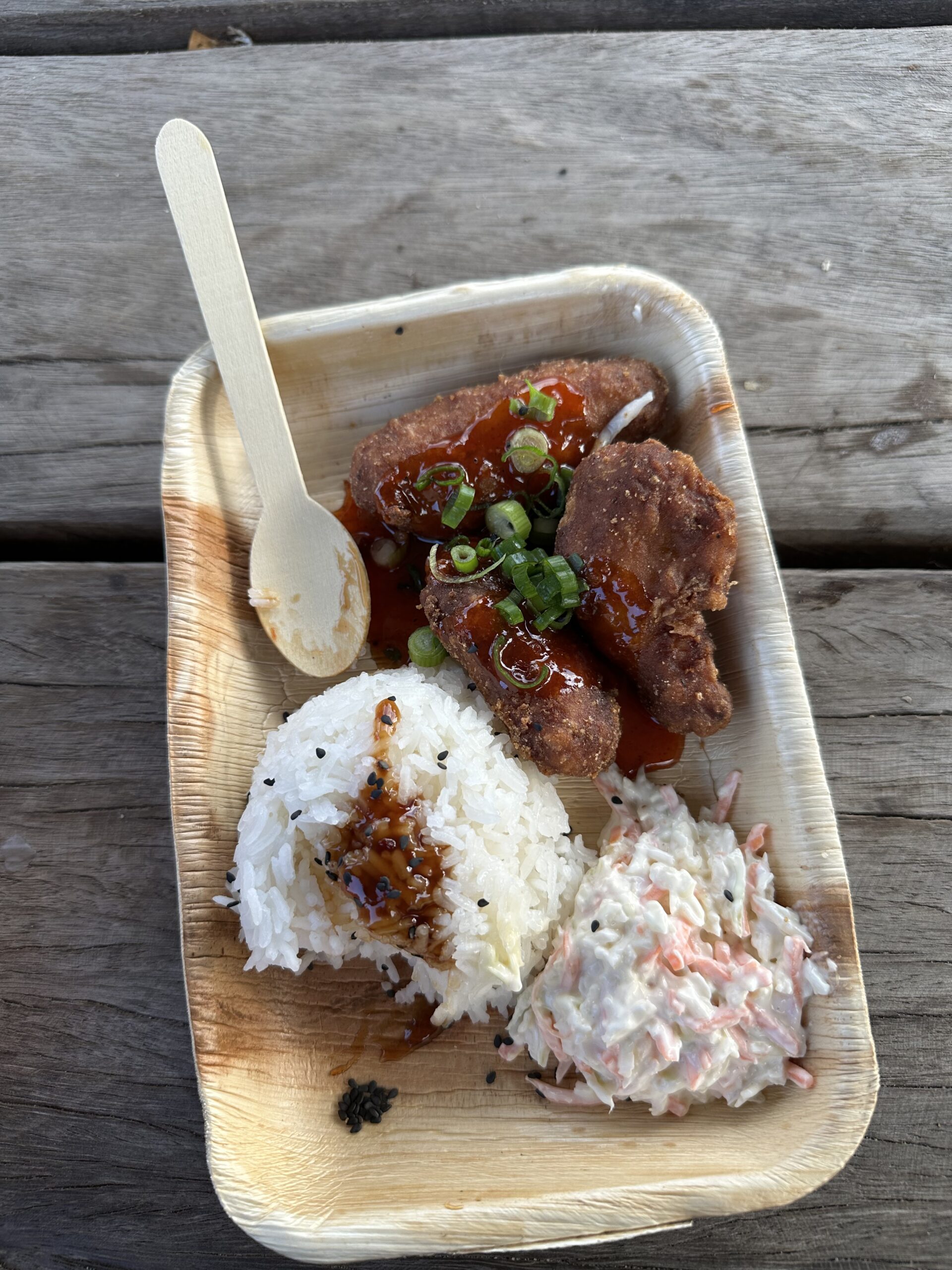 Drei knusprige Stücke in scharfer Sauce, dazu Reis mit Sesam und cremiger Coleslaw. Ein bunter Mix, der optisch und geschmacklich direkt abliefert.