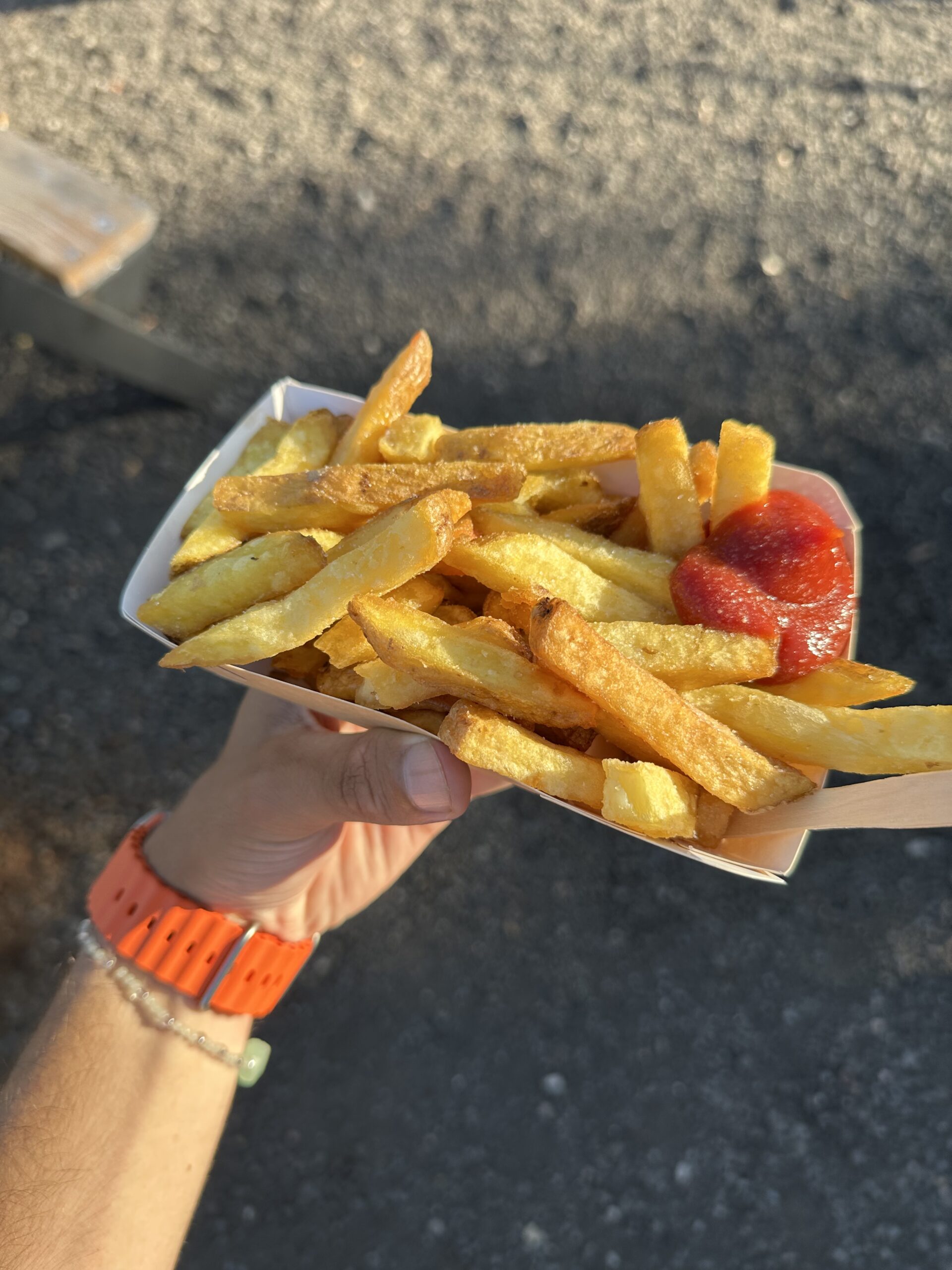 Goldgelbe Fritten mit einem ordentlichen Schlag Ketchup. Außen knusprig, innen weich und perfekt gesalzen – der ideale Snack auf die Hand für den Weg zum nächsten Set.