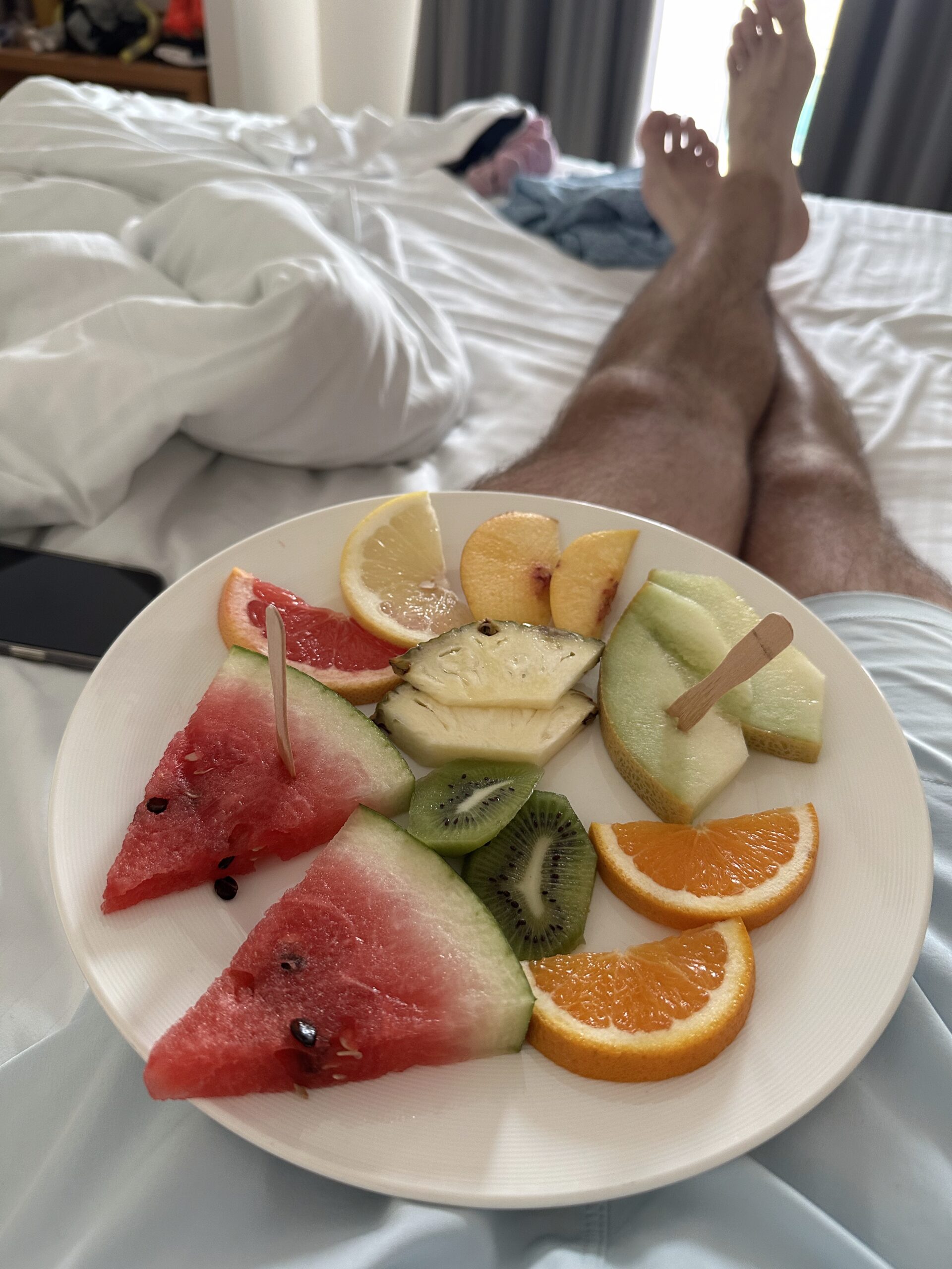 Nach dem Flug und der Langen fahrt mit dem Bus (mach ich nie wieder die 150€ für das Privat Shuttle investier ich das nächste mal) gab es einen Willkommens Obst Teller. Dieser stand auf unserer Terrasse schon etwas in der Sonne, aber war trotzdem sehr gut. Minus Aura an den Hotel Mitarbeiter der nicht geklopft hat xD.