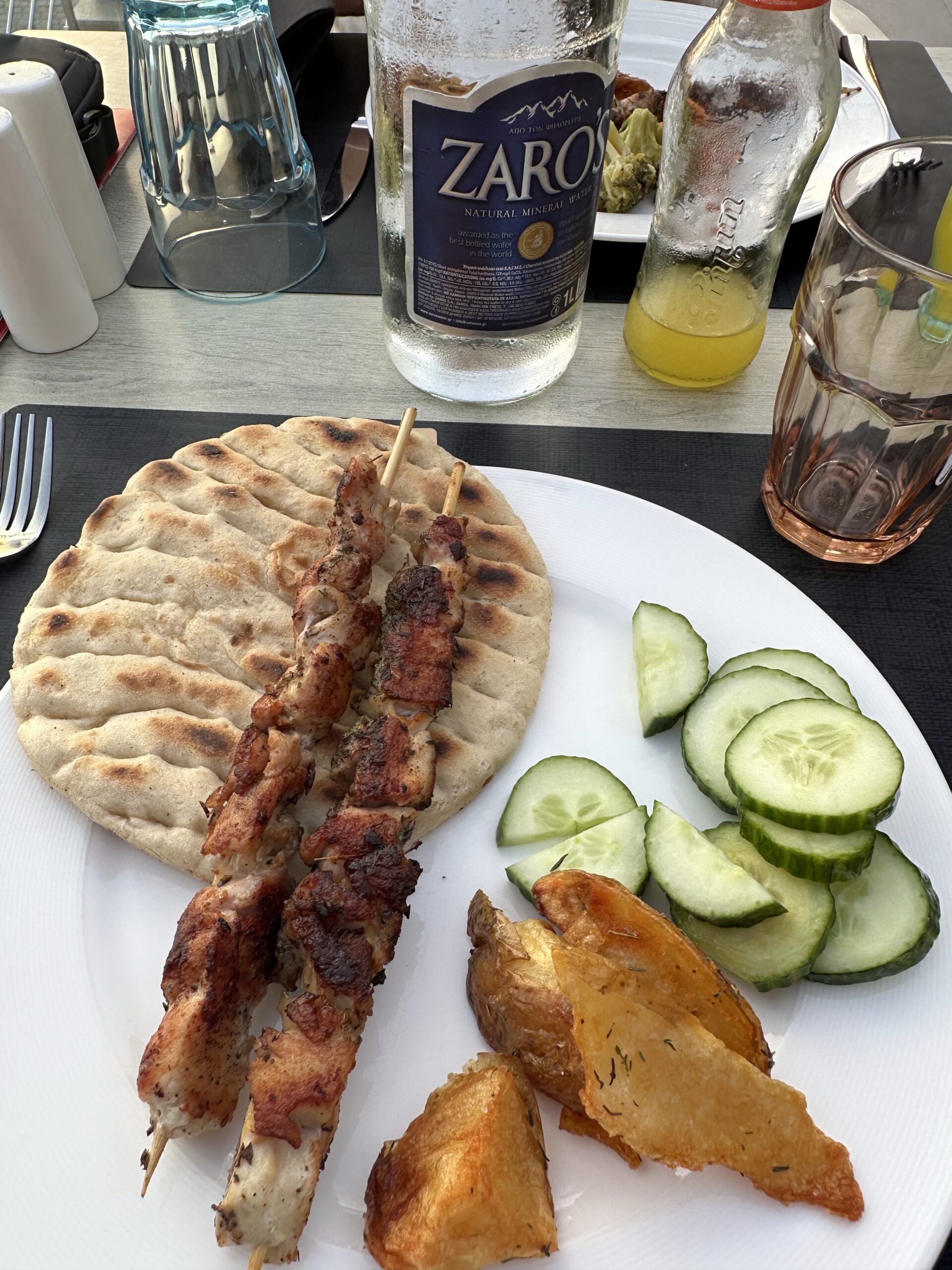 Zwei goldbraun gegrillte Souvlaki-Spieße auf einem fluffigen Fladenbrot, serviert mit krossen Kartoffelspalten und frischen Gurkenscheiben.