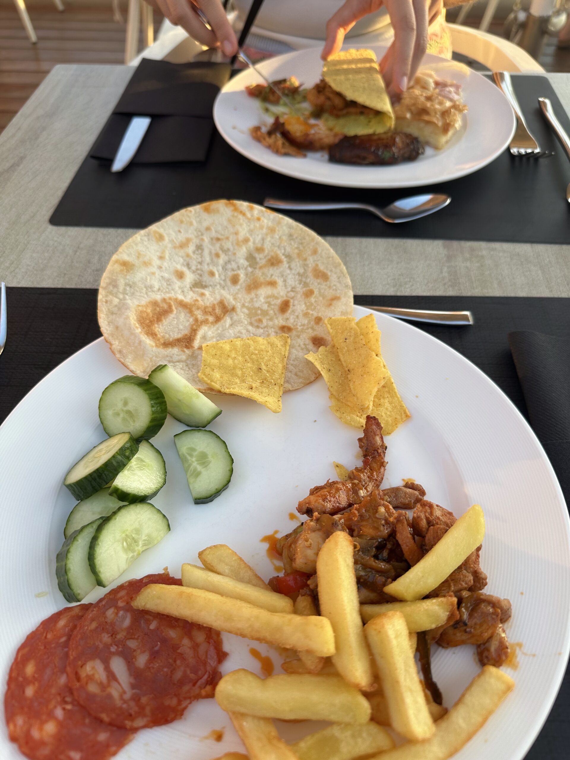 Würzige Fleischstreifen (Fajita-Style), krossen Pommes, frischen Gurkenscheiben und ein paar Scheiben Salami für das herzhafte. Dazu gibt es eine weiche Tortilla und ein paar Nachos als knuspriges Extra. Ein wilder, aber leckerer Mix!